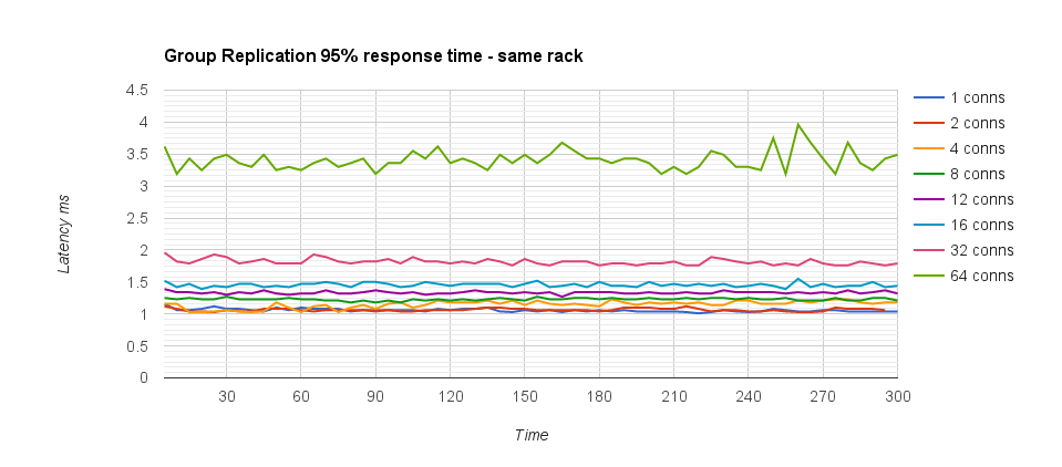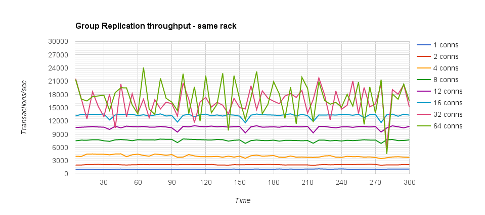 While with async replication we only tested the throughput with 64 connections on a write intensive workload to understand the upper boundaries, with Group Replication we tried several number of connections. In every test, only one writer node (single master) was used.